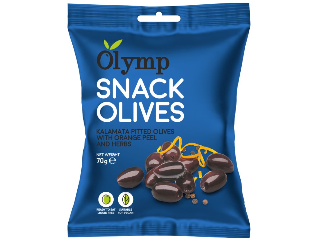 Las mejores aceitunas negras Kalamata de Grecia en un paquete para un refrigerio rápido y sabroso.