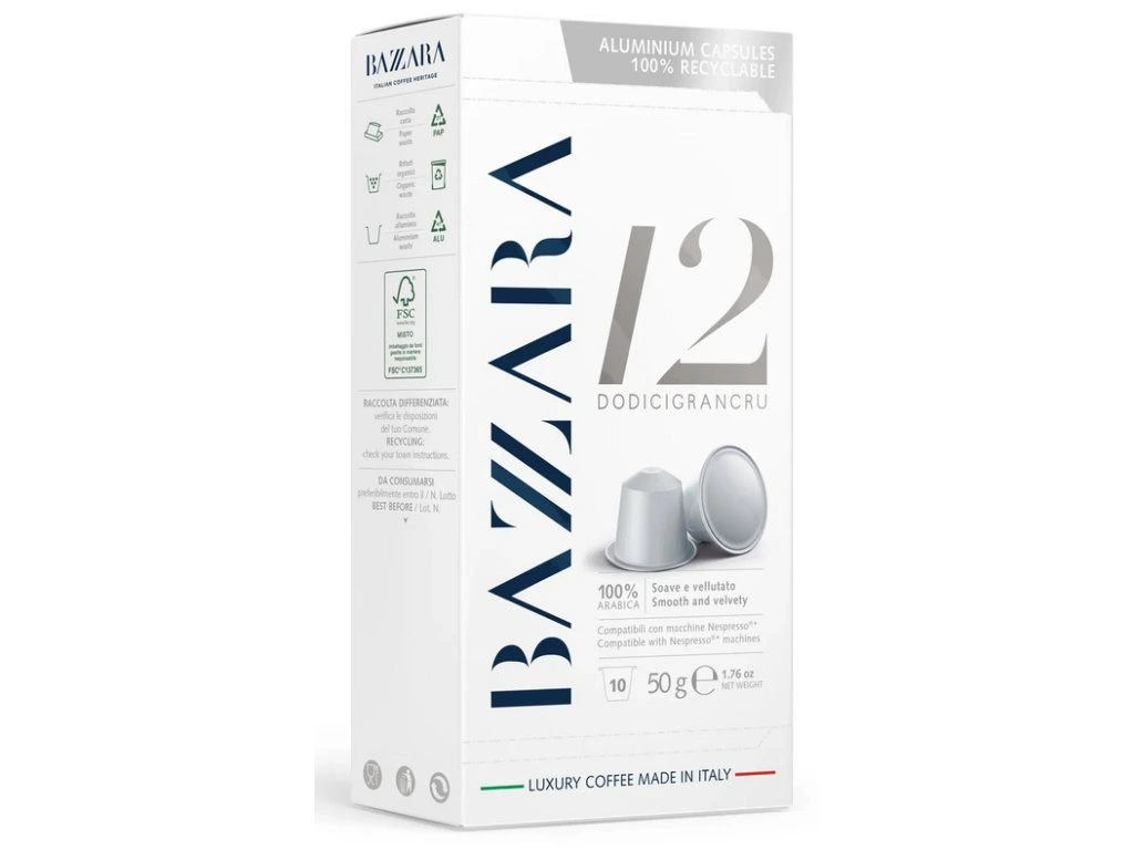 Embalaje: 10 cápsulas Nespresso de aluminio con 5 g de café molido Bazzara Dodicigrancru envasadas en una caja de papel.