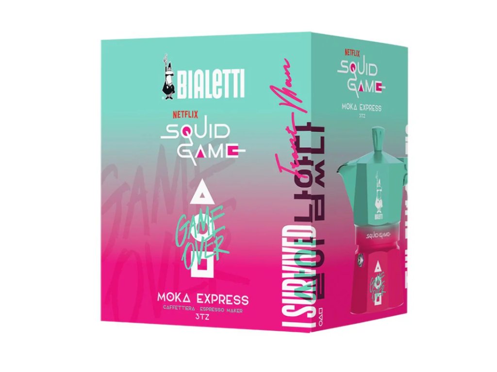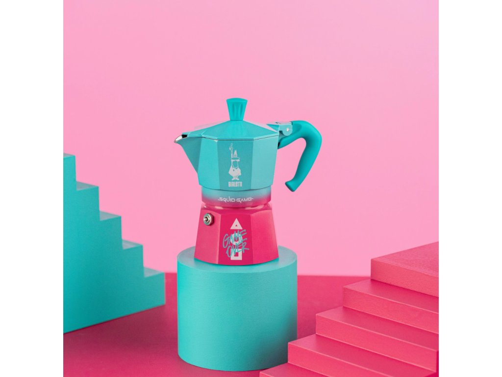 La Moka Express del Juego del Calamar es una edición limitada de cafeteras moka Bialetti, creada gracias a una colaboración directa entre Bialetti y Netflix. El diseño de las cafeteras combina un fondo rosa y cian con el logo blanco del Juego del Calamar y la icónica tríada de formas (triángulo, cuadrado, círculo), inspirada en la forma original del logo en coreano.