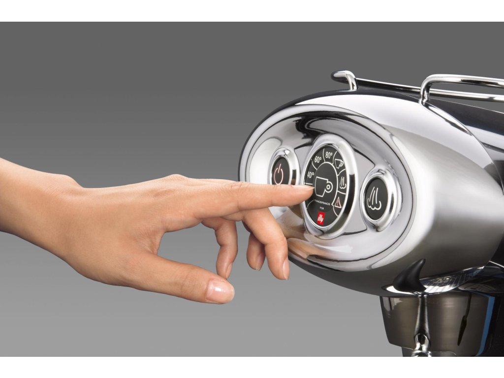 Puedes controlar la cafetera illy Francis X7.1 mediante tres paneles redondos. Además del botón de encendido, cuenta con un botón para controlar la boquilla de vapor y un panel principal con un botón de preparación de café. Puedes configurar el modo de preparación automático o manual con solo pulsar un botón. No te preocupes si no podrás preparar el café manualmente, ya que, por seguridad , el proceso se detendrá automáticamente después de aproximadamente un minuto, para evitar accidentes.
