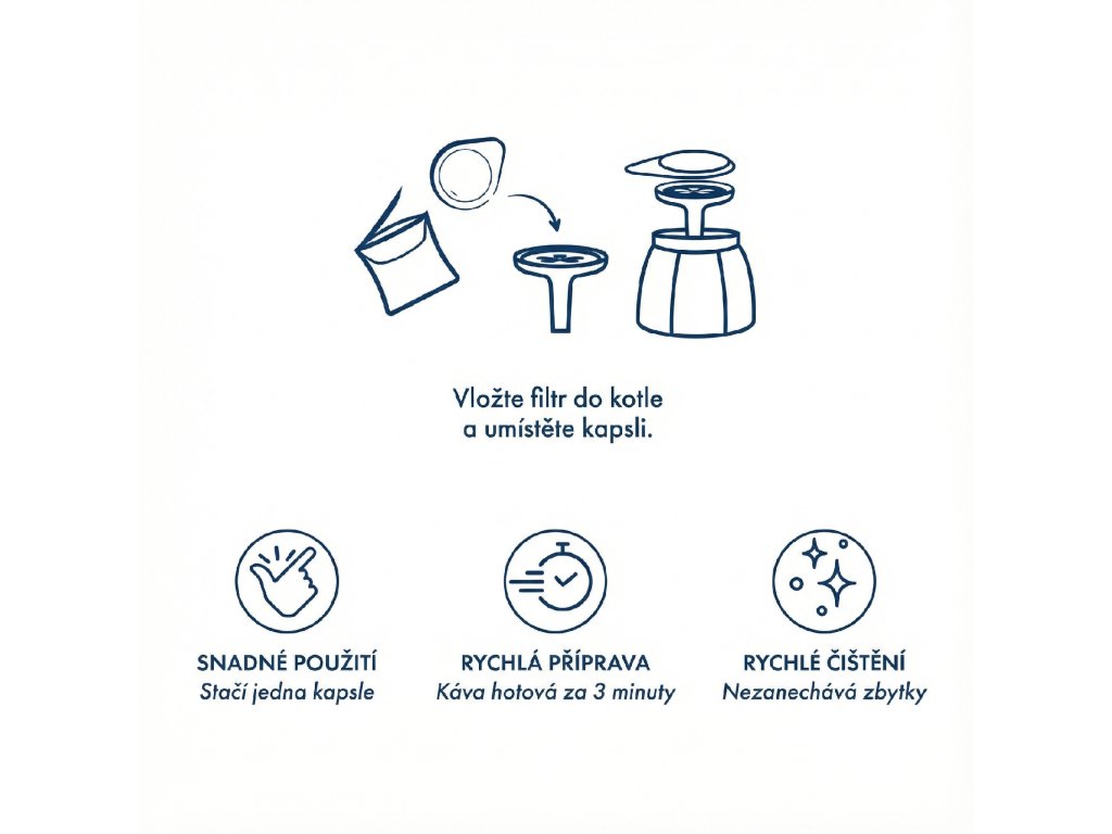 Sistema patentado: Cuerpo de aluminio con filtro de cápsula especial y caldera única que garantiza una mejor distribución del calor.
