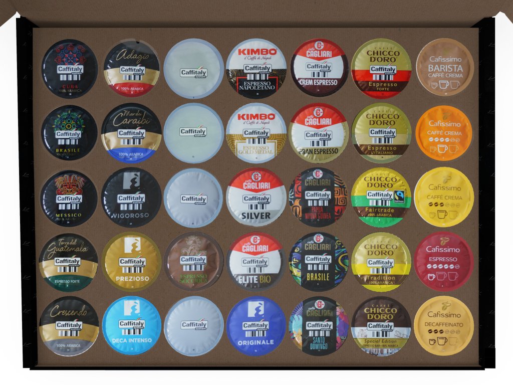 Prueba nuestra caja de prueba de cápsulas para Tchibo Cafissimo® y Caffitaly, que contiene cápsulas de Tchibo Caffissimo, Caffitaly Limitovane Edice, Kimbo, Cagliari, Chicco D ORO, Foodness y otras marcas. Puedes elegir las que más te gusten y pedir el pack completo la próxima vez.