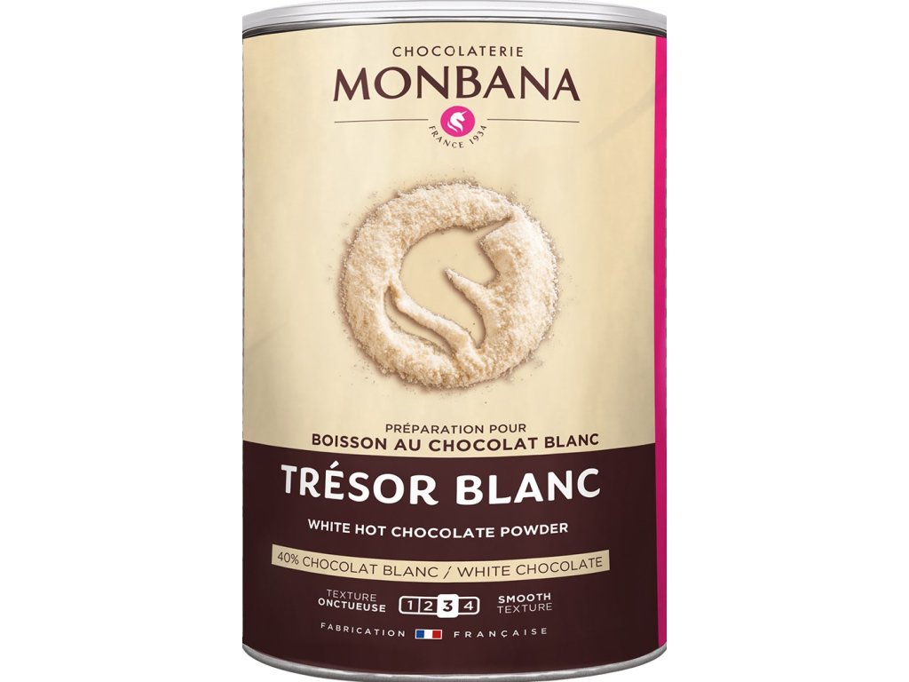 Mezcla instantánea para preparar una bebida caliente con chocolate blanco.