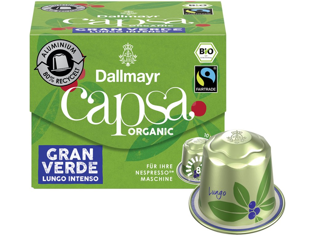 Disfrute de una taza de café excepcional con las cápsulas Dallmayr Capsa Lungo Intenso Organic. Esta mezcla 100 % orgánica proviene de plantaciones orgánicas cuidadosamente seleccionadas y destaca por su intenso aroma, sabor intenso y sutiles notas de cacao y frutos secos. La opción ideal para los amantes de un lungo intenso con un regusto largo y armonioso.