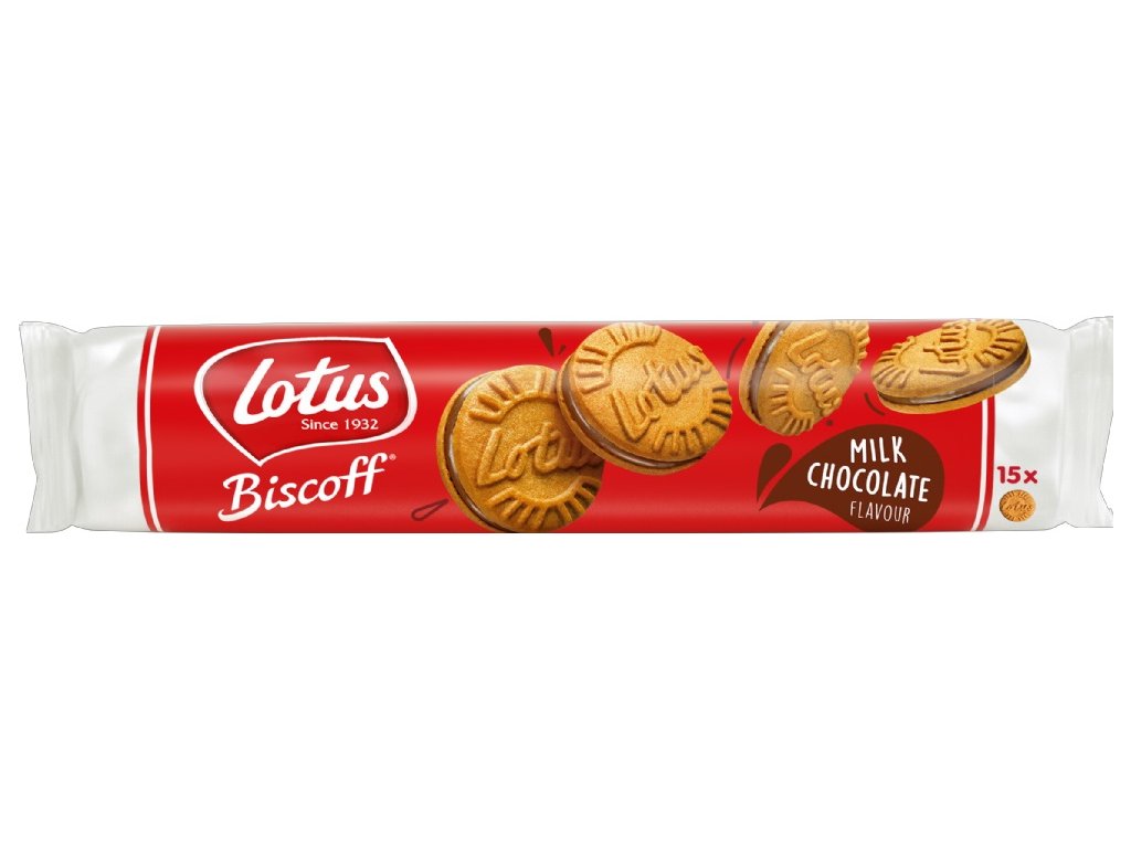 Galletas caramelizadas de loto con relleno sabor chocolate con leche 28%.