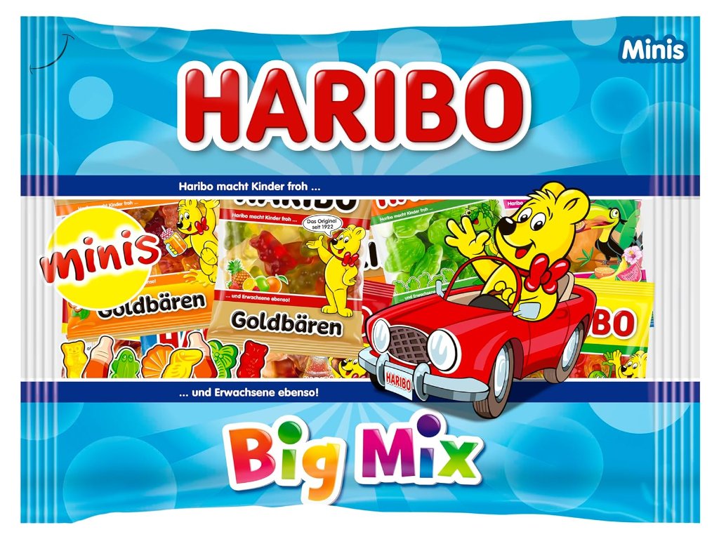 Un paquete grande que contiene 22 mini bolsitas de varios sabores : ositos dorados clásicos, ositos con jugo dentro, chupetes kinder, tropifruti, happy cola, ranitas quax.
