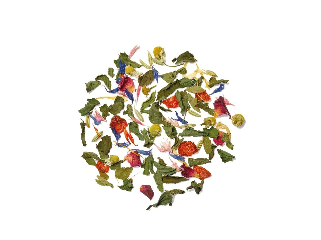 Las hierbas clásicas menta, ortiga y salvia se combinan con flores de manzanilla y caléndula, complementadas con anís e hinojo.