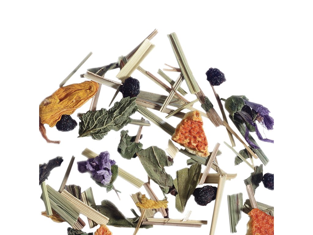 Ingredientes: Hierba limón, trozos de manzana, menta, cáscara de naranja, aroma de limón, hojas de girasol.