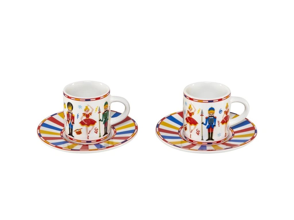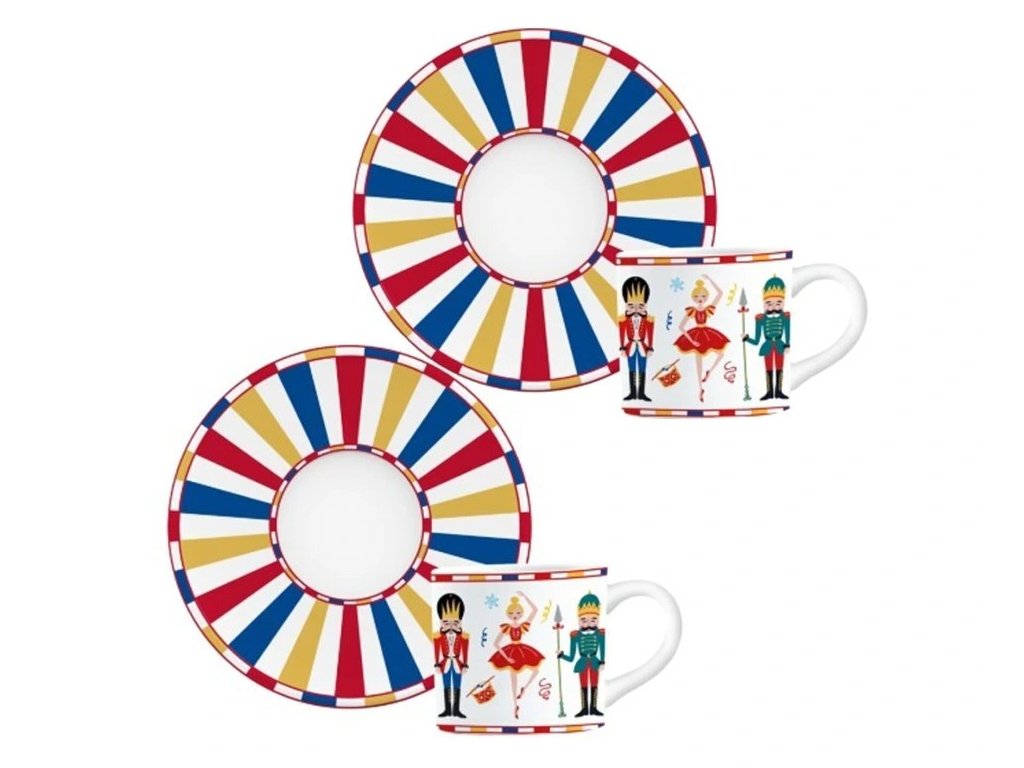 Juego de dos tazas y platillos de café de porcelana decorados con coloridos motivos del ballet Cascanueces. Edición limitada.