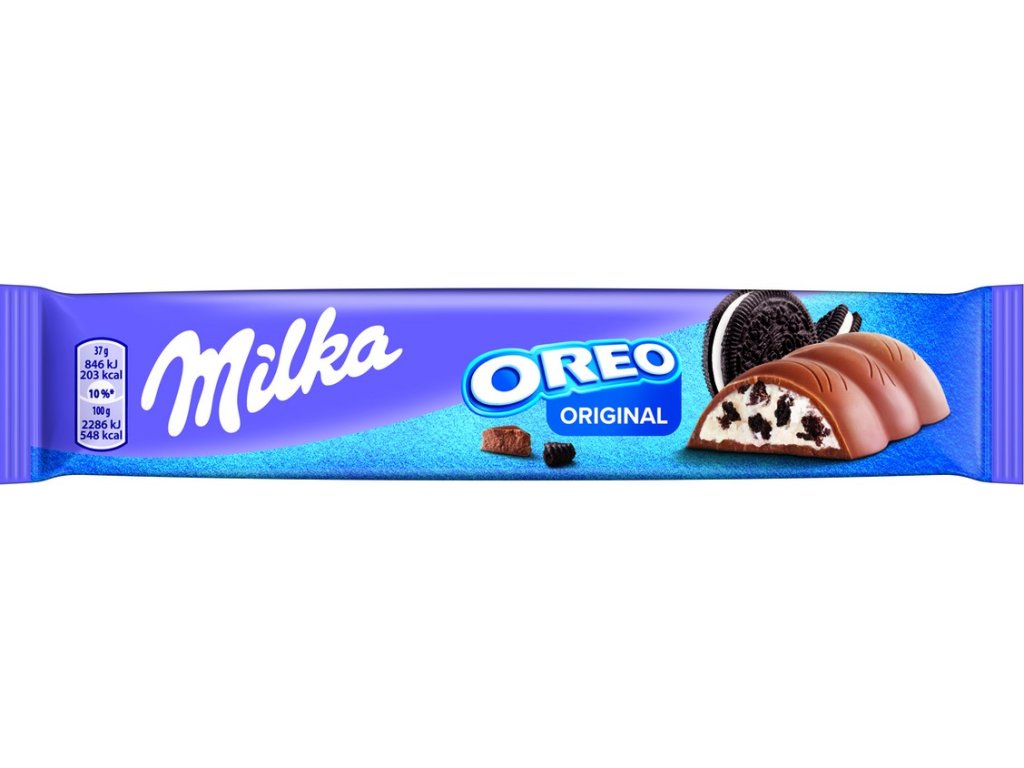 Trozos de galleta de cacao (15%) con crema de leche con sabor a vainilla (35%) en chocolate con leche alpino.