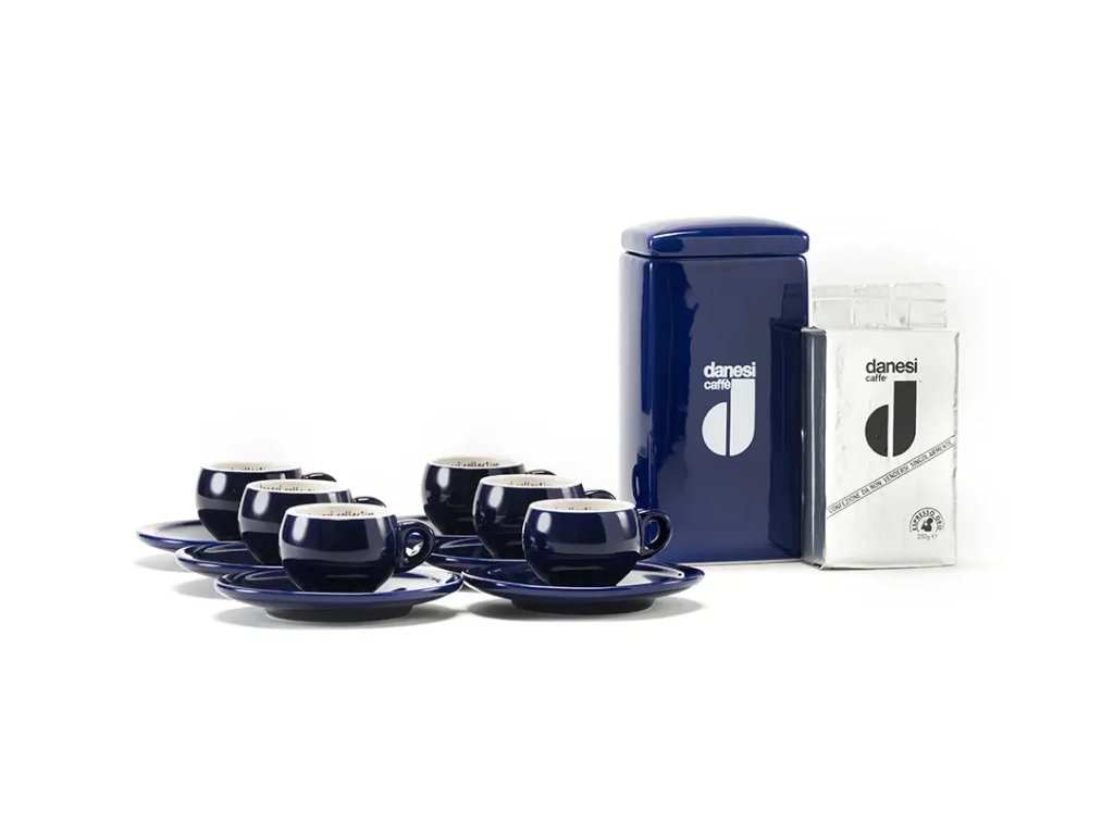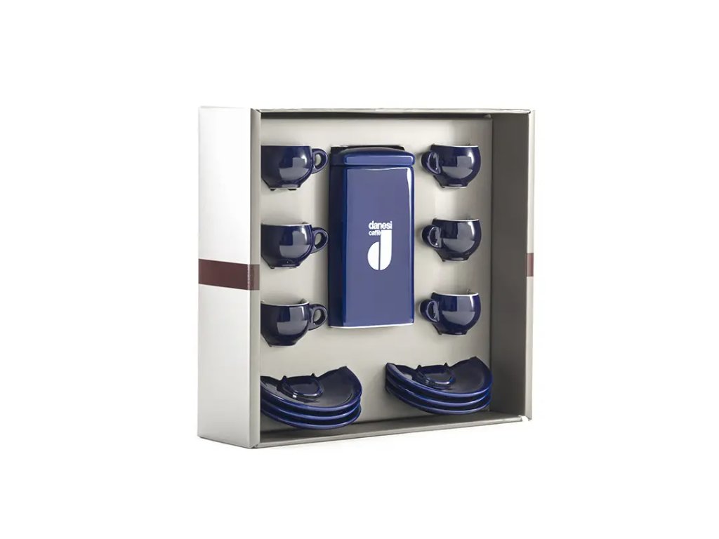 Pack regalo Danesi La Forma - Cassette de Kava Dark's 250 g + 6 tazas de espresso y 6 platillos - azul