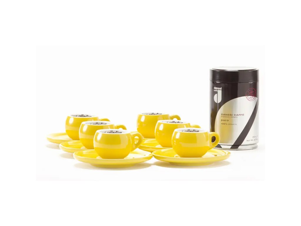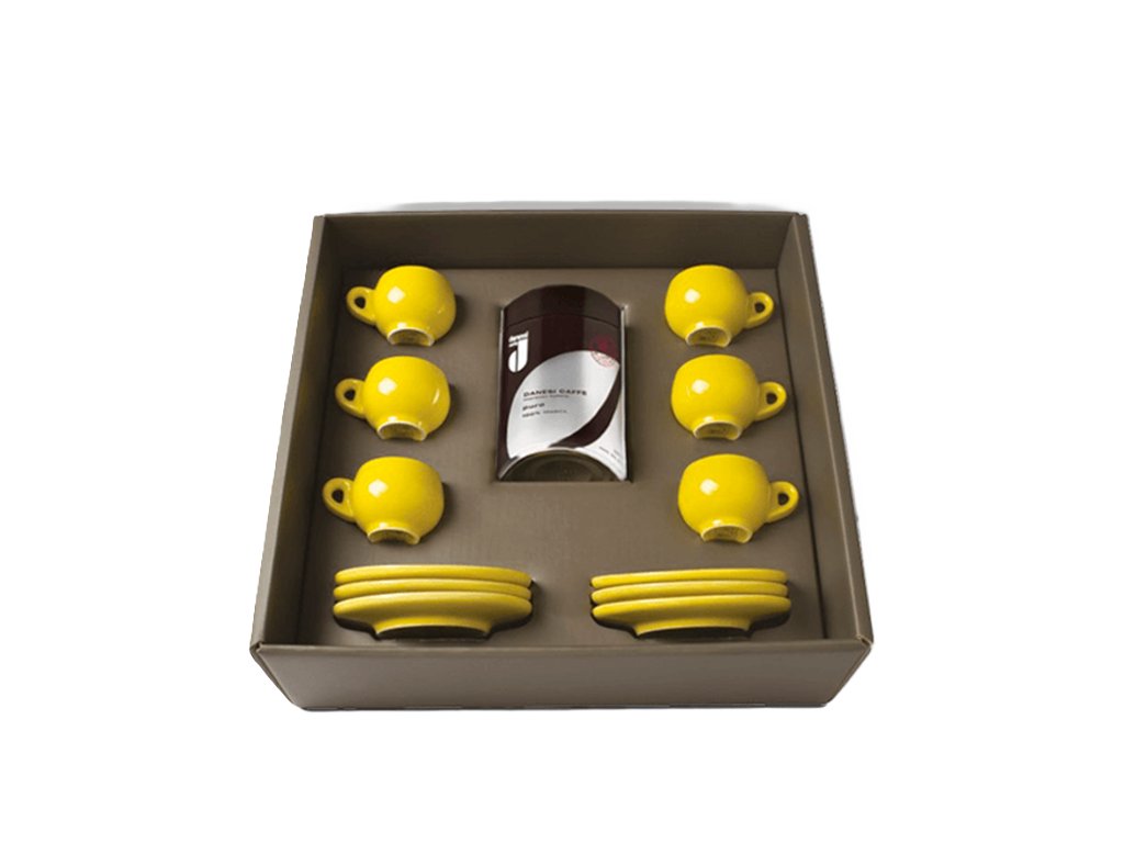 Pack regalo Sprint Danesi La Forma - Cassette de Kava Dark's 250 g + 6 tazas de espresso y 6 platillos - amarillo