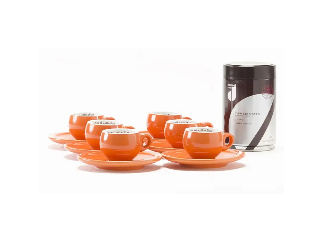 Pack regalo Sprint Danesi La Forma - Cassette de Kava Dark's 250 g + 6 tazas de espresso y 6 platillos - naranja