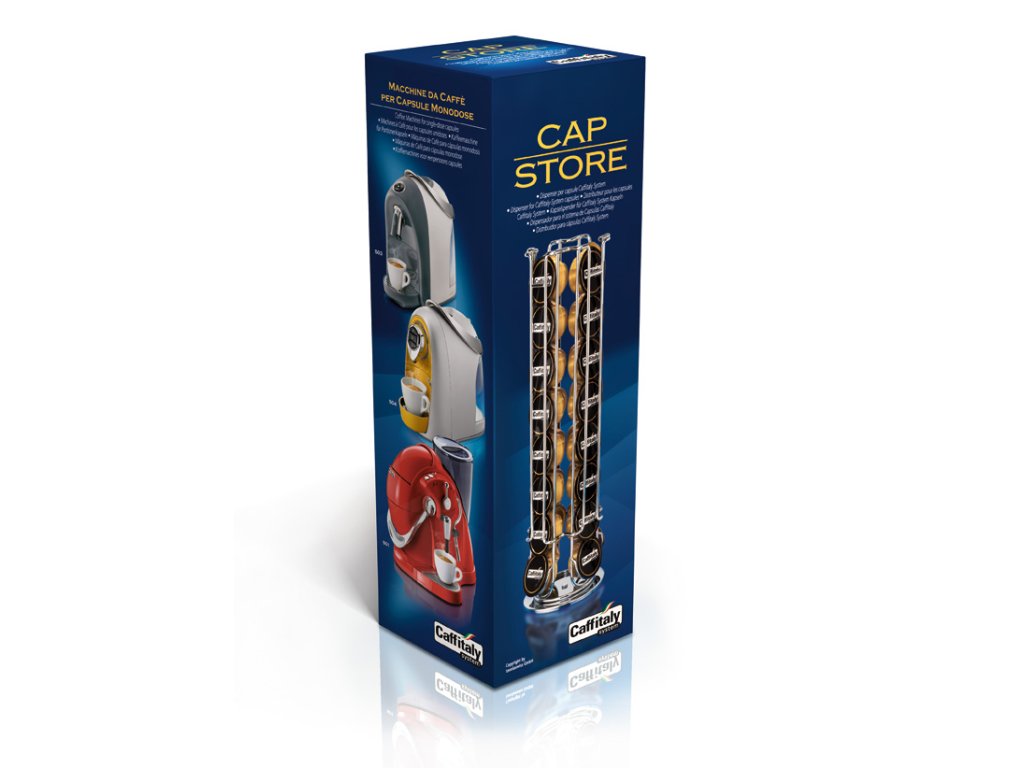 Práctico portacápsulas de metal cromado. Capacidad para 4 x 8 cápsulas en base giratoria. Un accesorio indispensable para quienes valoran la comodidad y el diseño, el exclusivo portacápsulas Caffitaly contiene un total de 32 cápsulas y está fabricado en resistente metal cromado.