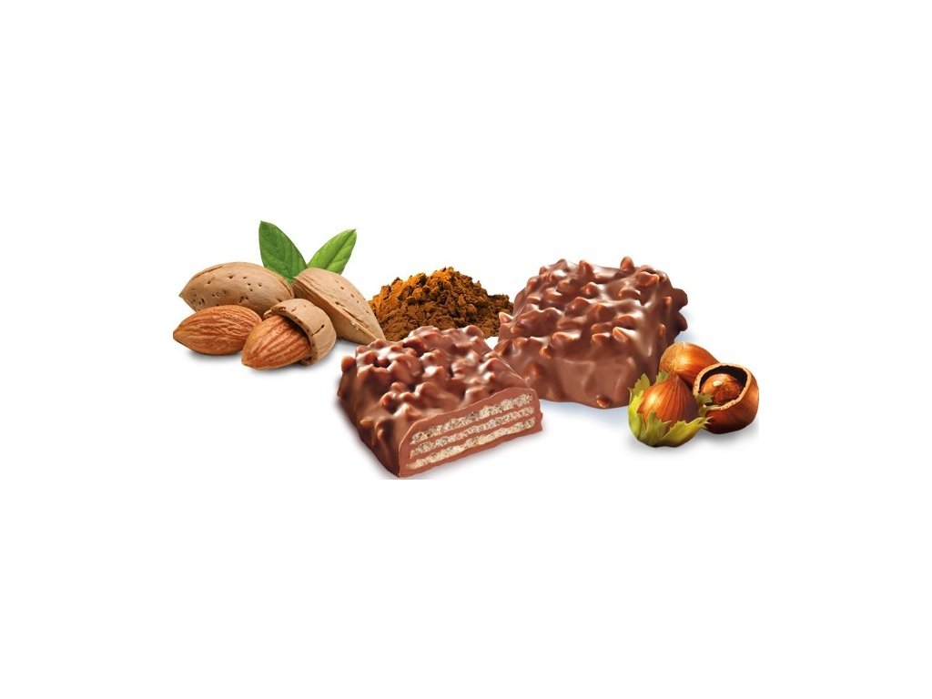 Gofres (10%) con un delicado relleno de crema de avellanas (27%) y delicado chocolate con leche.