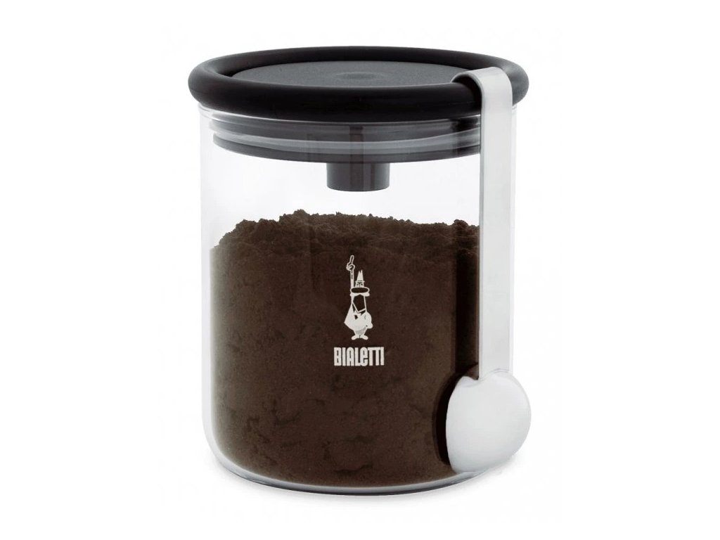 Elegante jarra de café de vidrio con el logotipo de Bialetti. Tiene una capacidad aproximada de 250 gramos. La combinación de diseño de vidrio y tapa de silicona permite conservar el aroma del café a largo plazo.