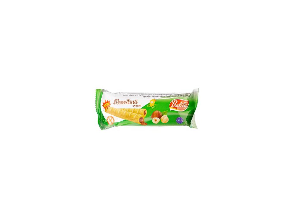 Tubitos de maíz esponjosos rellenos de crema de avellanas (83%).