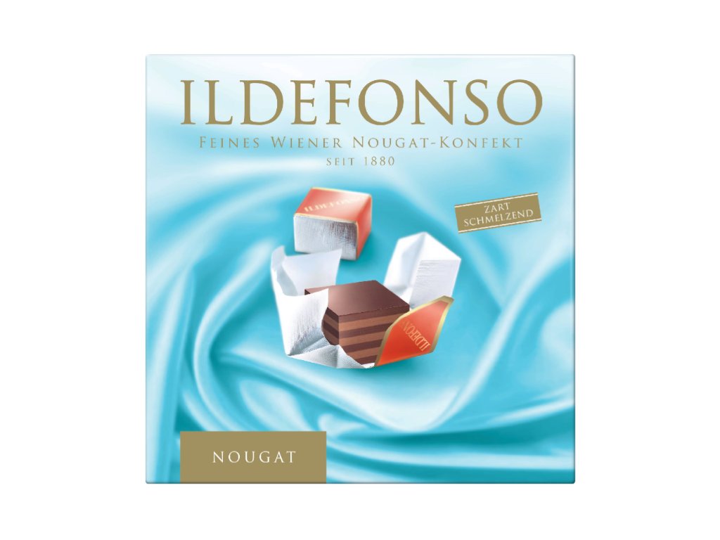 Esta popular caja de turrón de chocolate Manner presenta crema de avellanas cubierta con chocolate negro, que Manner elabora a partir de granos de cacao que tuesta ella misma.