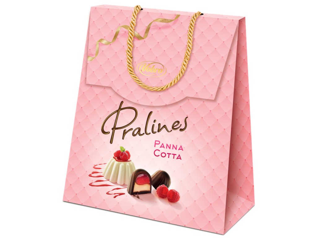 La bolsa contiene pralinés de chocolate negro rellenos de Panna Cotta y frambuesas.